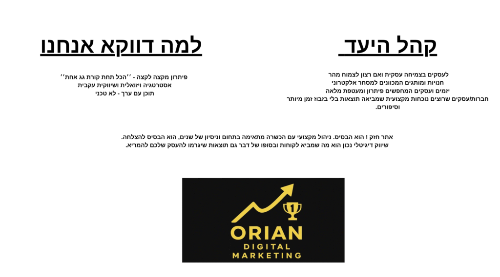 אנחנו בונים רק אתרים מקצועיים שמספקים תוצאות - ומספקים פתרונות שיווק דיגיטלי מקיפים, כך שכל הנוכחות המקוונת של העסק שלכם מנוהל במקום אחד עם מחוייבות אישית אחראי מגובש ויעיל